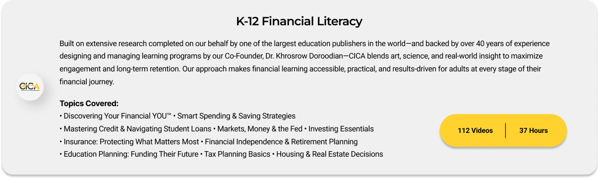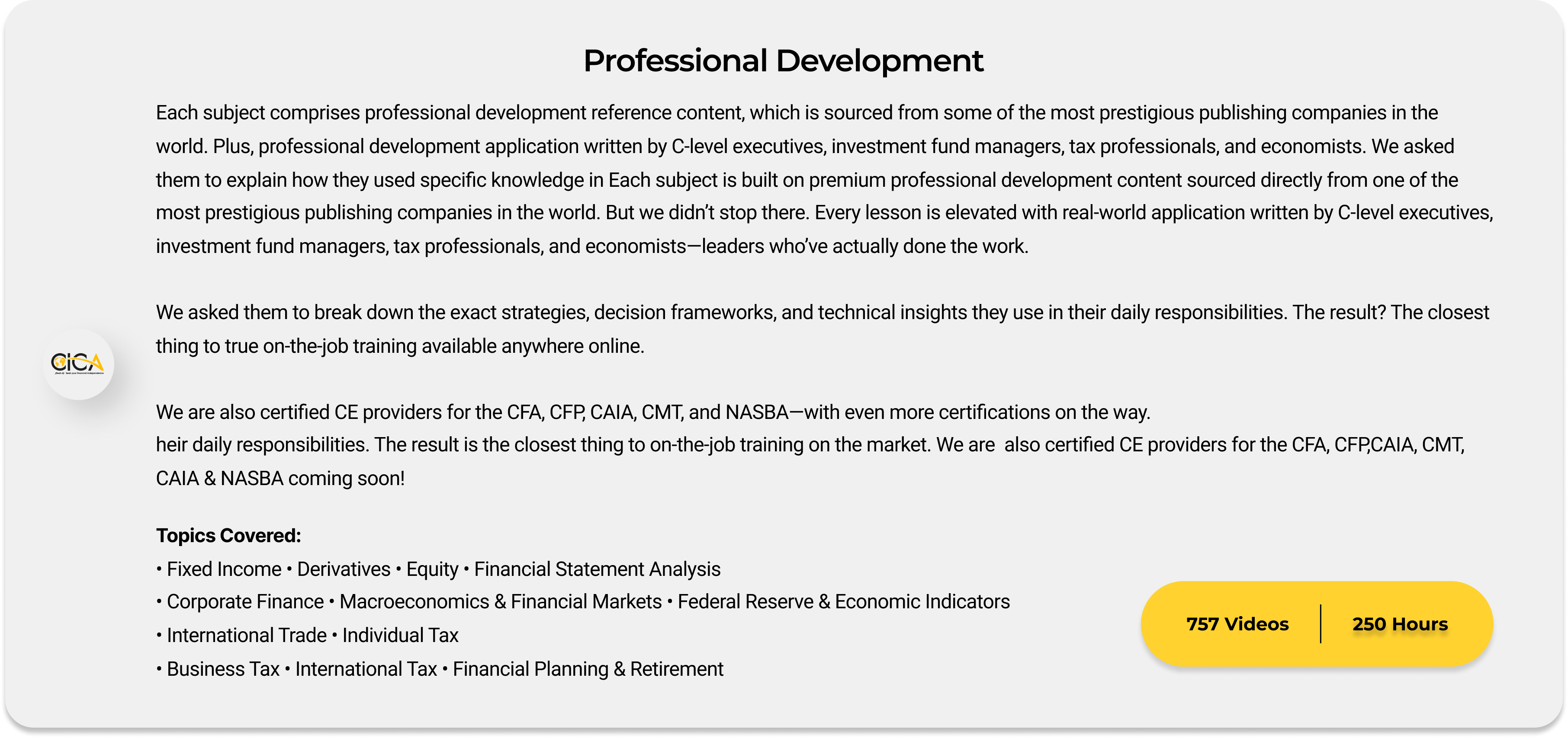 At CICA, we believe that knowledge is most valuable when it's not just theoretical but grounded in real-world application. That's why our courses are designed not only to impart real-world definitions directly from finance professionals but also to empower you with practical skills. Upon successful completion of any of our courses, you won't just have knowledge; you'll have mastery. And to recognize your achievement, you'll receive a prestigious Certificate of Completion. This certificate serves as a testament to your expertise, showcasing to the world that you've not only learned from the best but have also applied that knowledge effectively. It's a tangible symbol of your dedication to financial literacy and your commitment to real-world success.